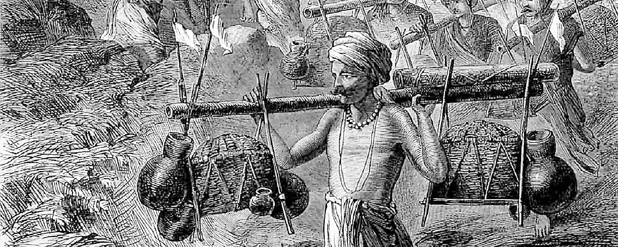 “It is at this point of emergence from the hills that persons journeying from a great distance are anxious to fill their jars with water, that their homes may be hallowed by a portion of the sacred element. Rich and pious Hindoos, who inhabit the provinces remote from this spot, spend large sums of money in procuring it by means of messengers, who are employed specially for the purpose. The water-pots are oftentimes conveyed to their destination in a picturesque manner, being enclosed in a framework decorated with flowers and feathers, and slung upon bamboos resting on the shoulders of long files of men, who will convey it thus, without contamination, for several hundred miles. The bearers of the sacred fluid, although enjoying immunity from danger from all other enemies, are yet frequently waylaid and murdered by the Thugs…”