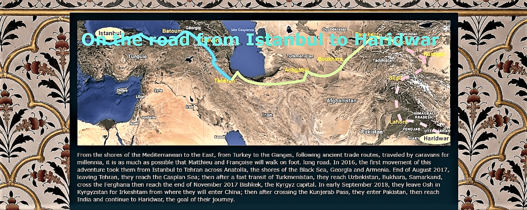 2016 from Istanbul in Turkey and walked through Georgia, Armenia, and Iran. In the 2nd stage in 2017, they started in end of August from Iran, and walked through Turkmenistan, Uzbekistan, and Kyrghistan. In the third stage, they started in end of August 2018 in Osh, and walked in to China. Crossing 5000 high mountains they entered Pakistan. Travelling through Gilgit and Islamabad, they finally entered India at Wagah border near Amritsar. From there they walked to Chandigarh and then to Yamunanagar where they were joined by 2 other Frenchmen. They walked to Dehradun and then to Rishikesh. Starting from Rishikesh they finally reached their goal in Haridwar.