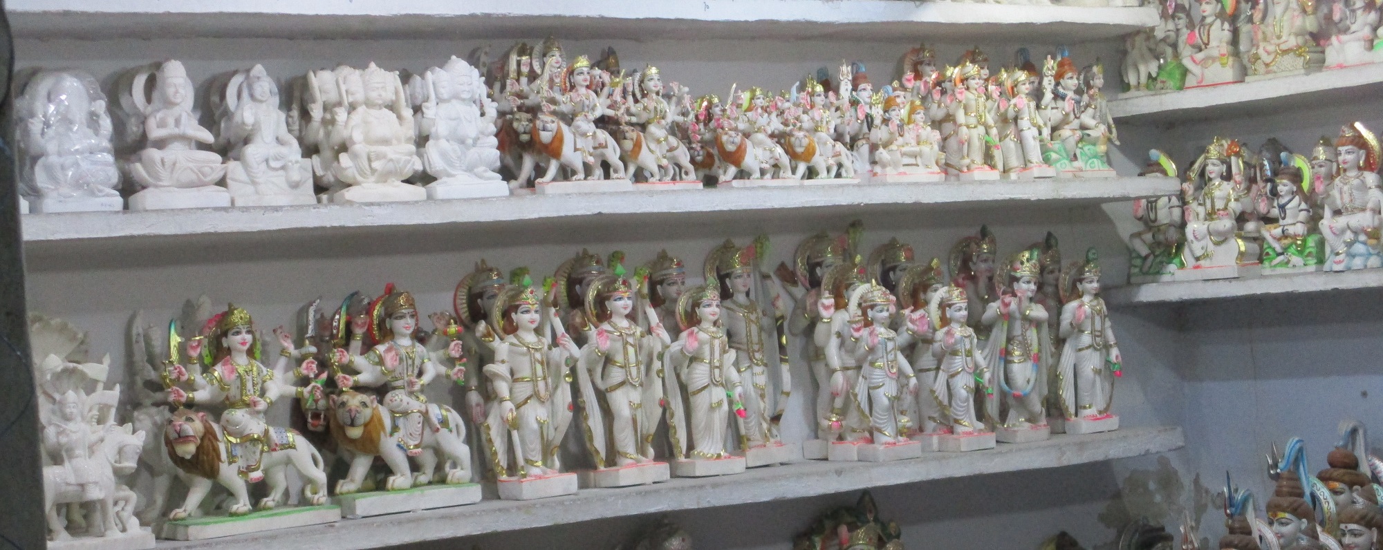 A particular area in the Moti Bazaar of Haridwar is the regional centre for the statues of deities. There are several work-shops in the by-lanes hidden from the main streets and lanes. Roughly hewed stones — marble, sandstone, and granite — in the shapes and with iconography of specific deities are commissioned by these work-shops. The rough shapes are cut in stones in the western state of Rajasthan.