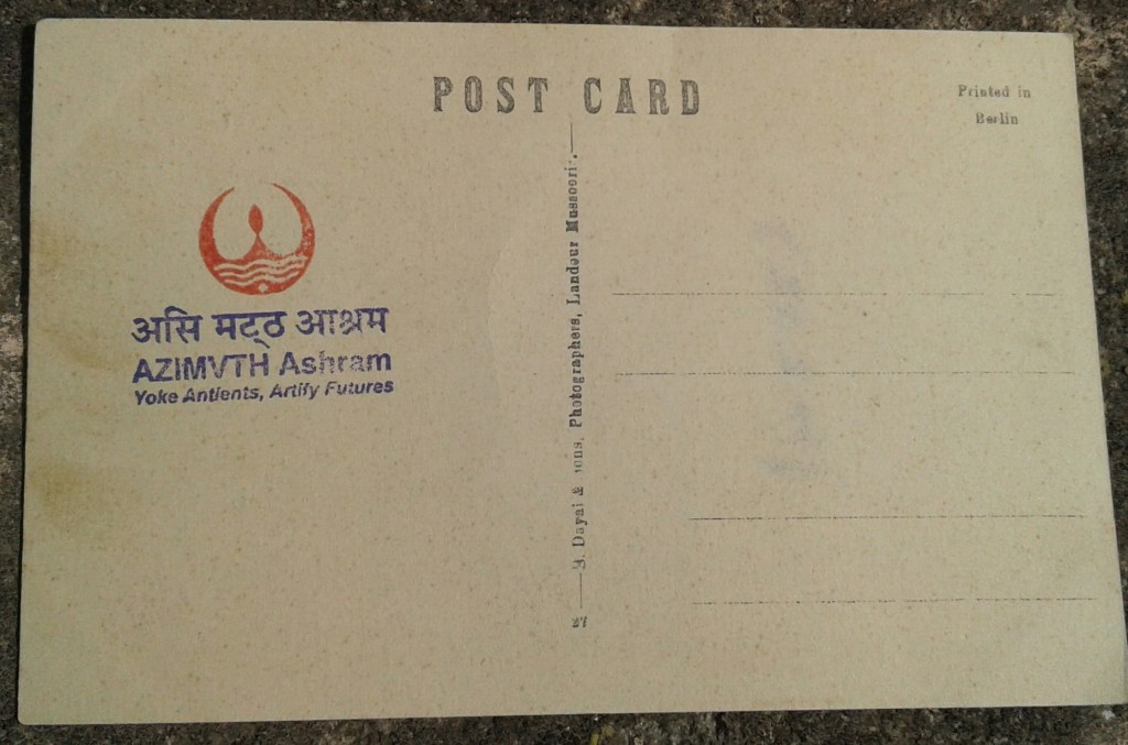 This vintage picture post card is titled ‘Kellogg Memorial, Mussoorie’. The reverse has printing ‘B. Dayal & Sons, Photographers, Landour, Mussoorie, Printed in Berlin’. It houses a language school where a lot of American students and diplomats visit to learn the Hindi language. This card is archived at the AZIMVTH Ashram Museum in Haridwar India.