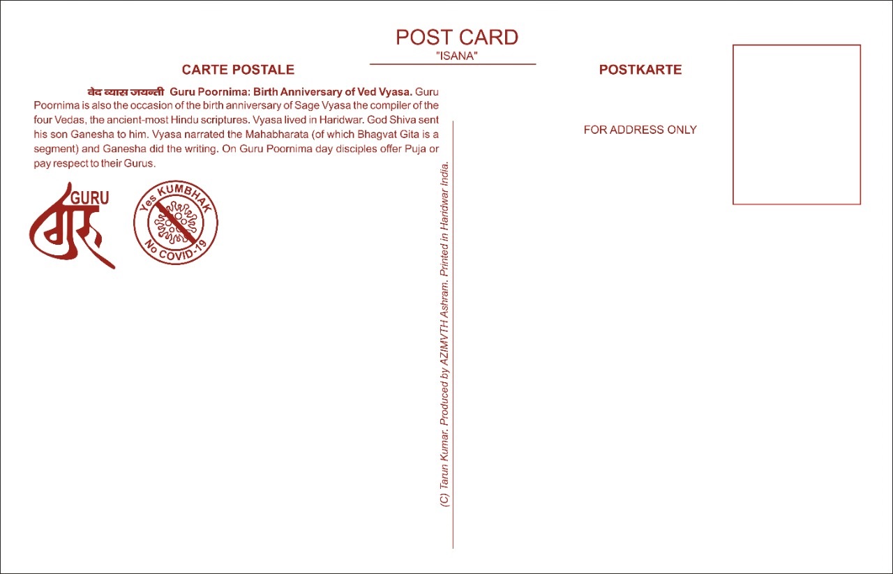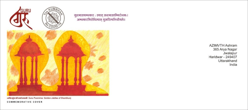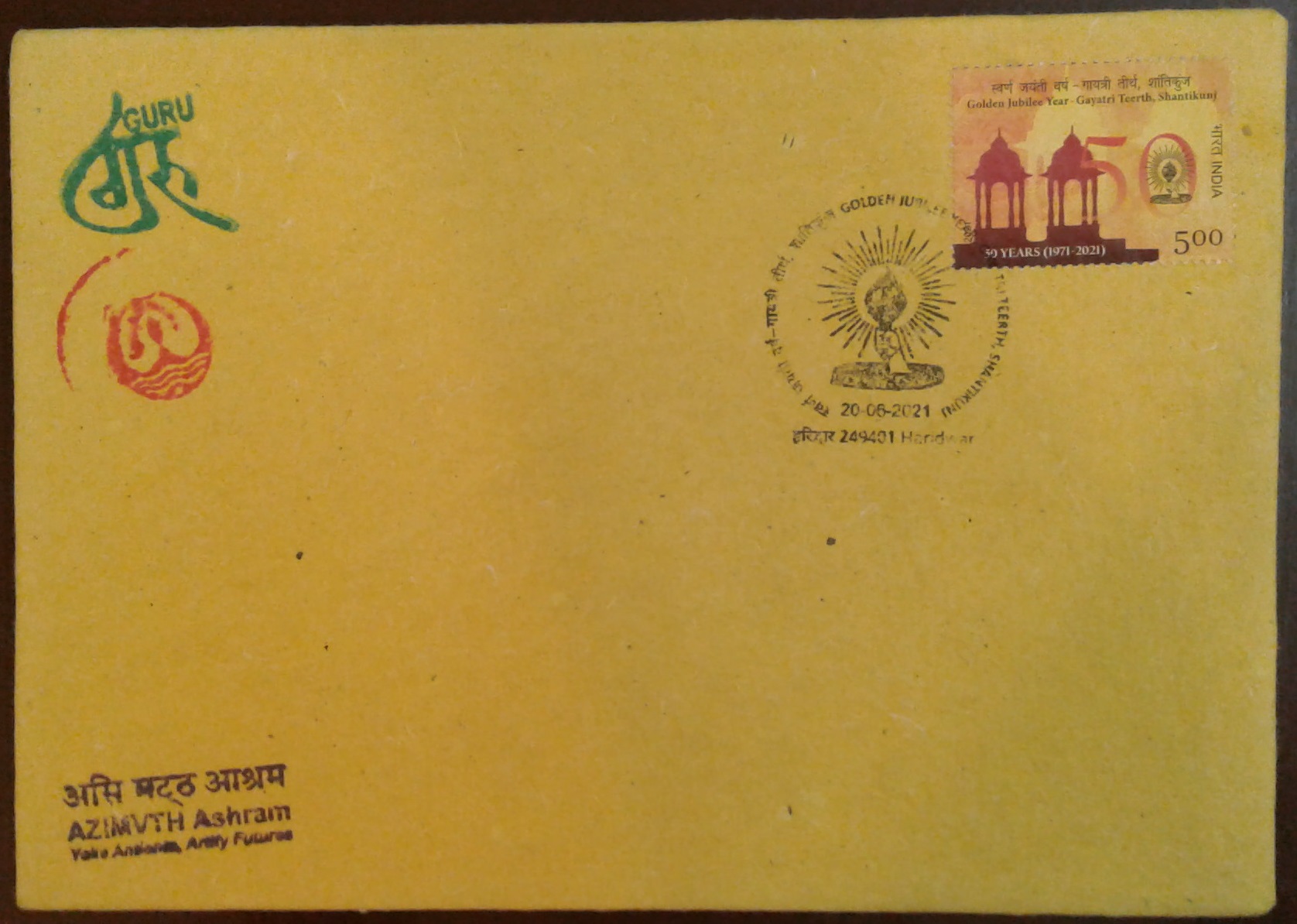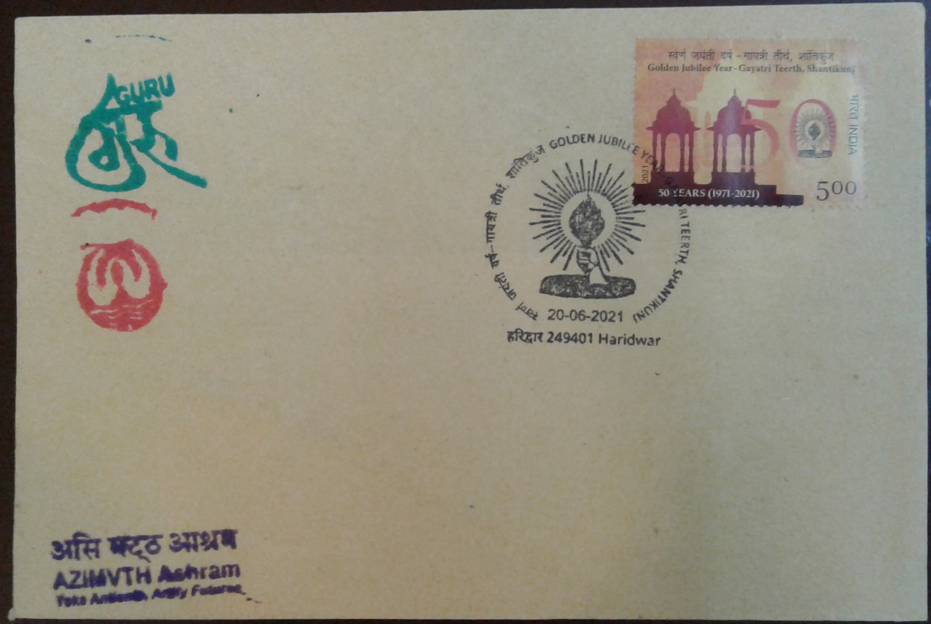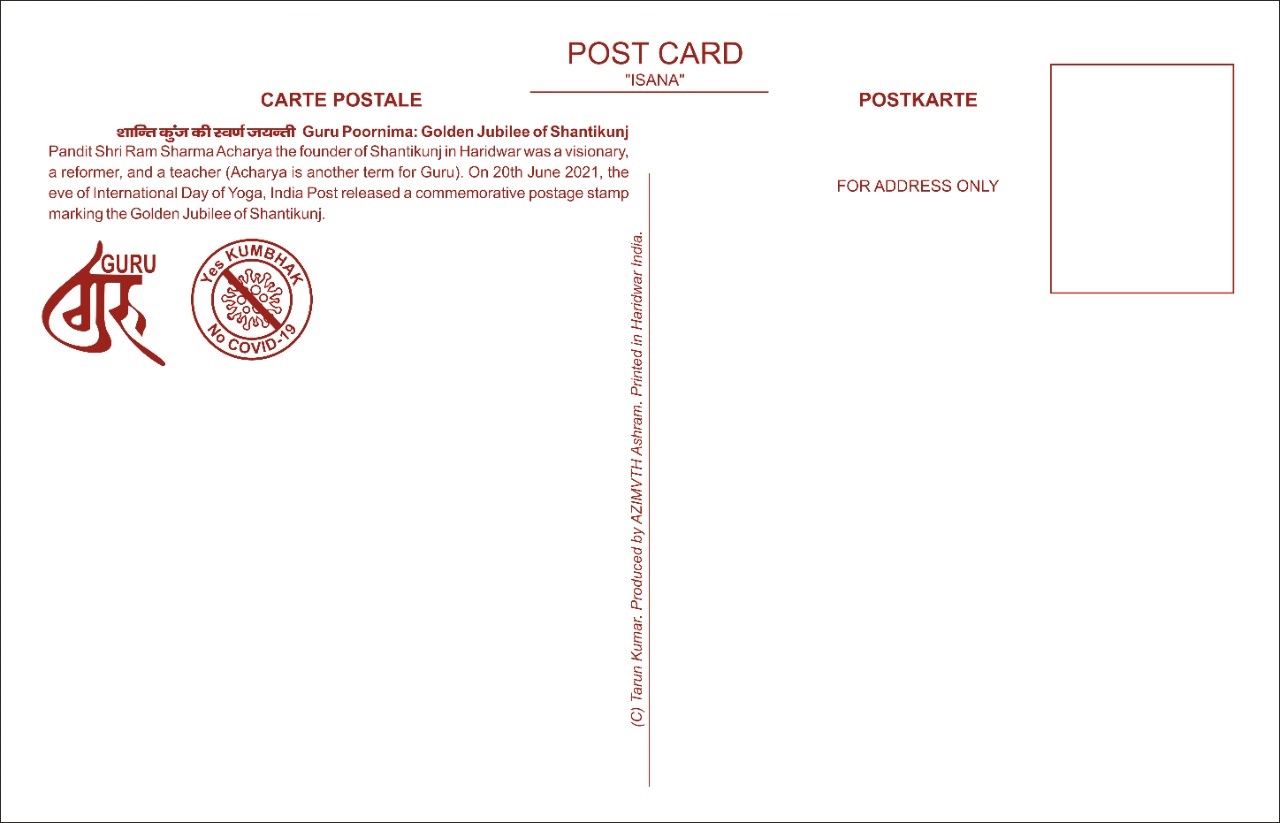 A Commemorative postage stamp of Rs. 5 with text ‘Gayatri Teerth Shantikunj’ was affixed to each. This new stamp was released in Haridwar on 20th June 2021, the eve of International Yoga Day, commemorating the Golden Jubilee of Shantikunj Haridwar. These cards, covers and stamps were cancelled with a postmark of ‘Shantikunj’ on the date of Guru Poornima.