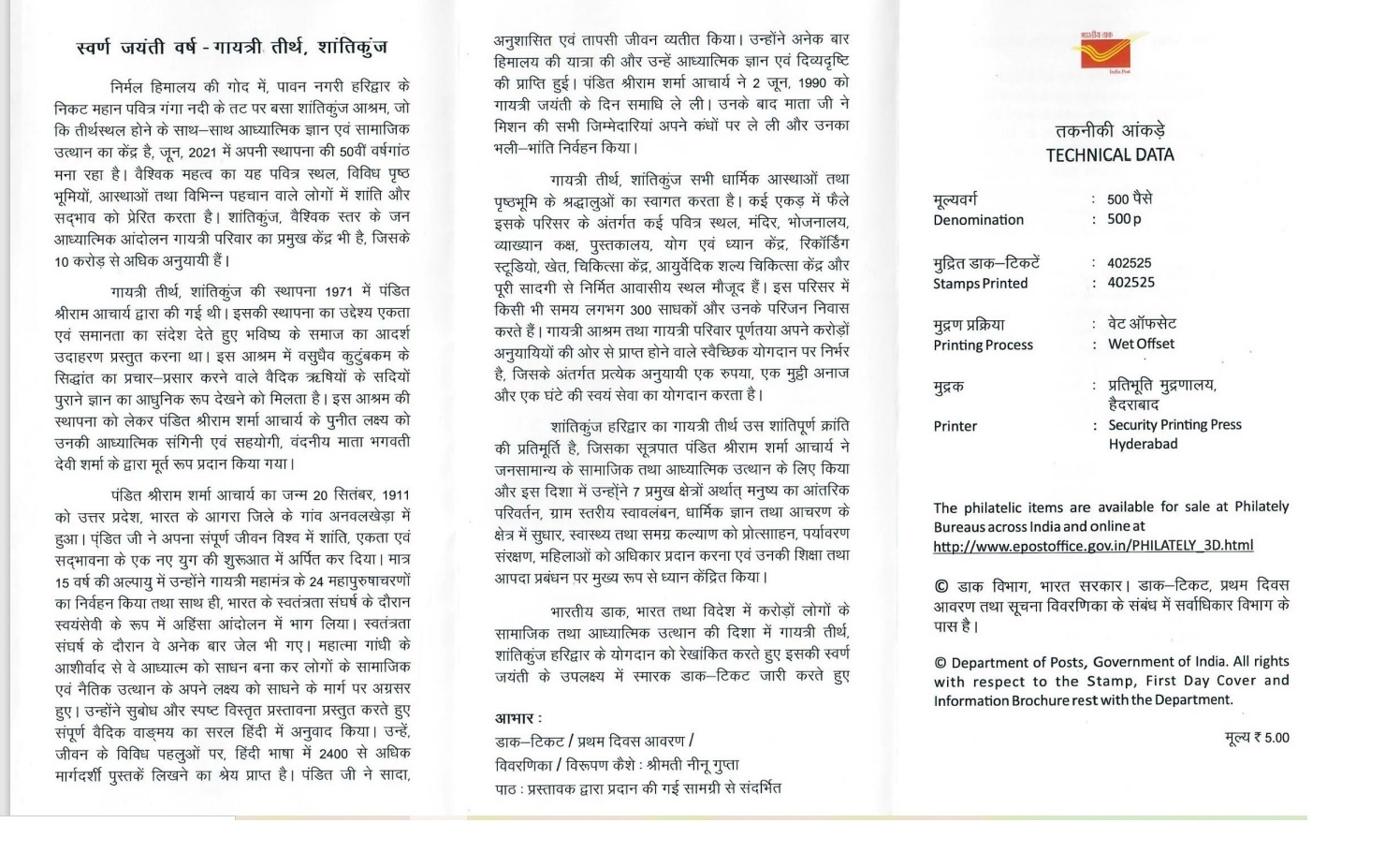 Pandit Shri Ram Sharma Acharya the founder of Shantikunj in Haridwar was a visionary, a reformer, and a teacher (Acharya is another term for Guru). On 20th June 2021, the eve of International Day of Yoga, India Post released a commemorative postage stamp marking the Golden Jubilee of Shantikunj.