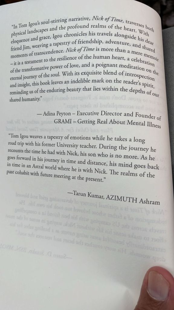 “Tom Igou weaves a tapestry of emotions while he takes a long road trip with his former University teacher. During the journey he recounts the time he had with Nick his son who is no more.”